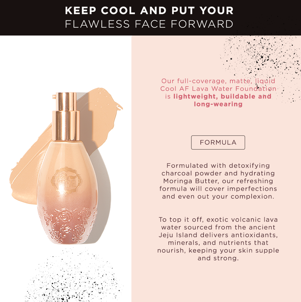 Keep cool and put your flawless face forward. Our full-coverage, matte, liquid Cool AF Lava Water Foundation is lightweight, buildable and long-wearing. Formulated with detoxifying charcoal powder and hydrating Moringa Butter, our refreshing formula will cover imperfections and even out your complexion. To top it off, exotic volcanic lava water sourced from the ancient Jeju Island delivers antioxidants, minerals, and nutrients that nourish, keeping your skin supple and strong. Perfect for normal, combination, and oily skin types.