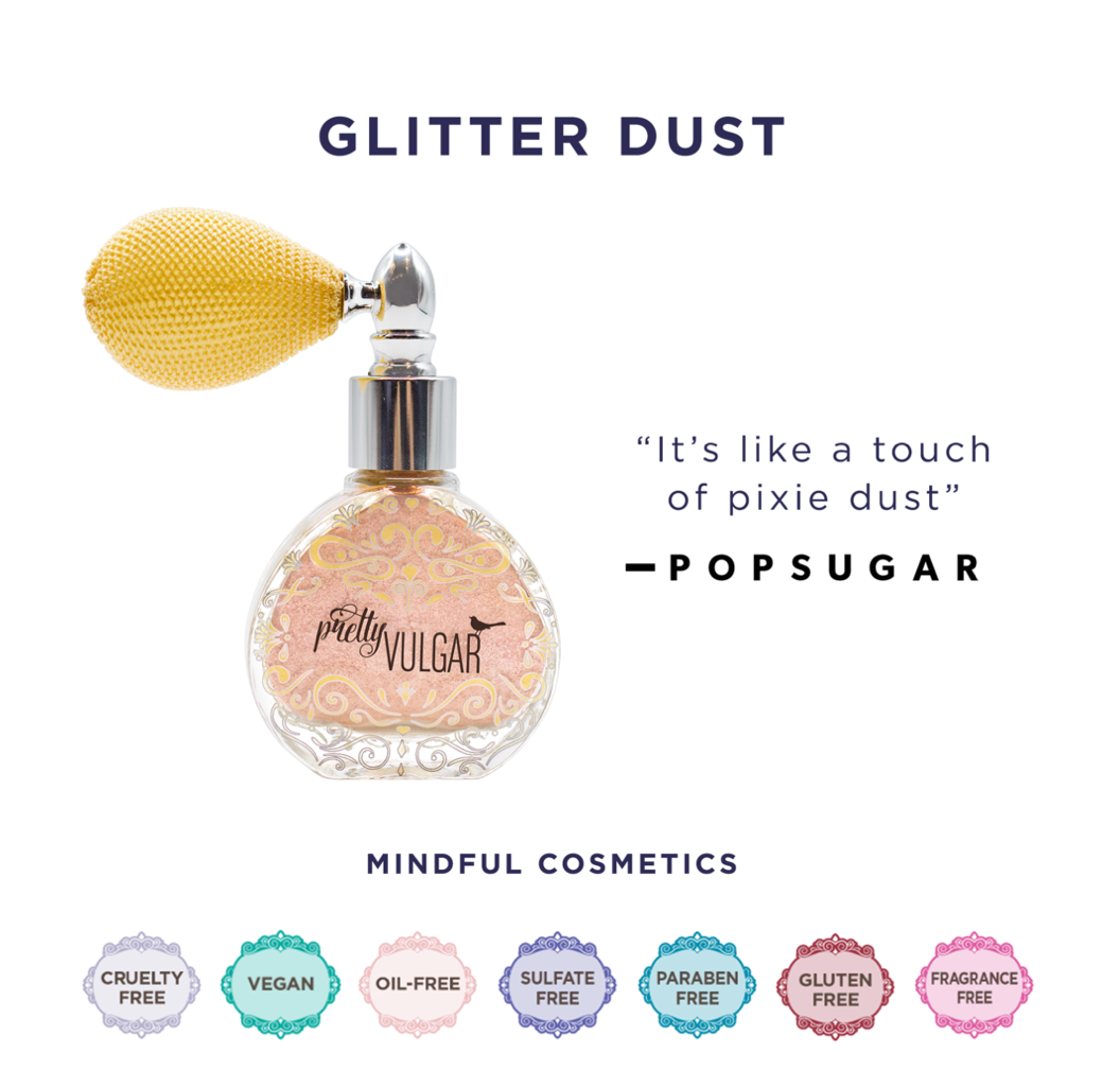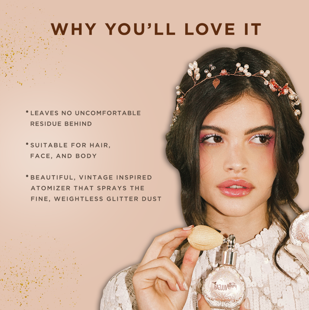 Pretty Vulgar's Glitter Dust is the extra touch to complete any glam look. Add a little sparkle or add a lot, this Glitter Dust is a silky smooth powder that contains light-reflecting pearls for a radiant finish. Suitable for hair, face, body and even décolletage, this fine shimmer dust is a sophisticated highlight for radiance from head to toe. The elegant antique component finely dusts you with our weightless formula, leaving no uncomfortable residue.